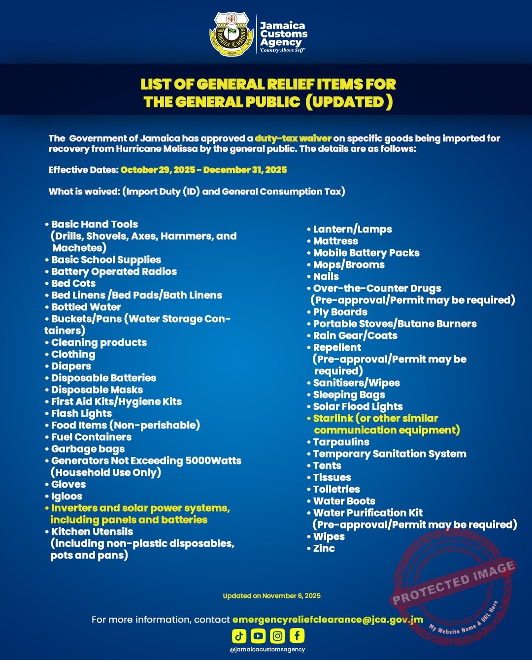 While the Government of Jamaica has generously waived custom duty fees on relief items until December 31, 2025, we must ask that you, the donor, cover all associated shipping and clearance costs. This ensures that our limited funds remain dedicated to purchasing new supplies locally.